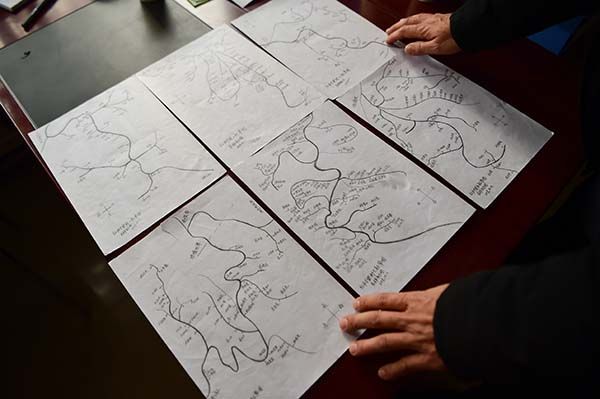 ↑刘吉祥在展示他自己手绘的红树梁村地图底稿(1月16日摄)。