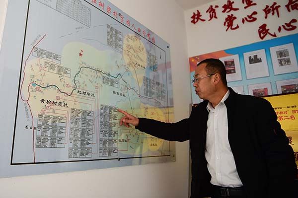 ↑刘吉祥在介绍根据手绘地图改进的红树梁村地图,地图丰富了贫困户信息、人畜饮水、道路等信息(1月16日摄)。