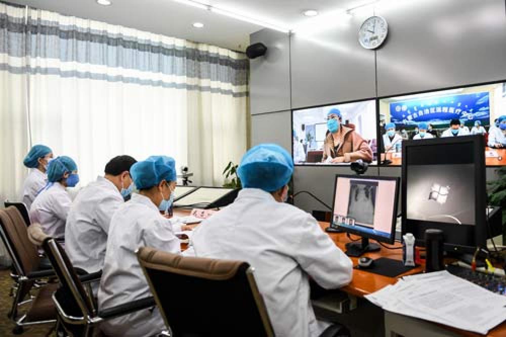 ↑2月14日,在内蒙古自治区远程医疗中心,专家们正在进行远程会诊。新华社记者刘磊摄