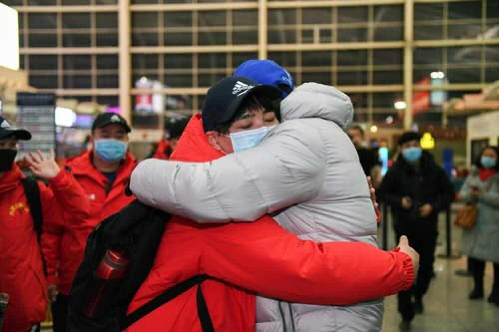 ↑2月15日,内蒙古自治区第五批支援湖北医疗队成员在白塔机场和亲属告别。新华社记者刘磊摄