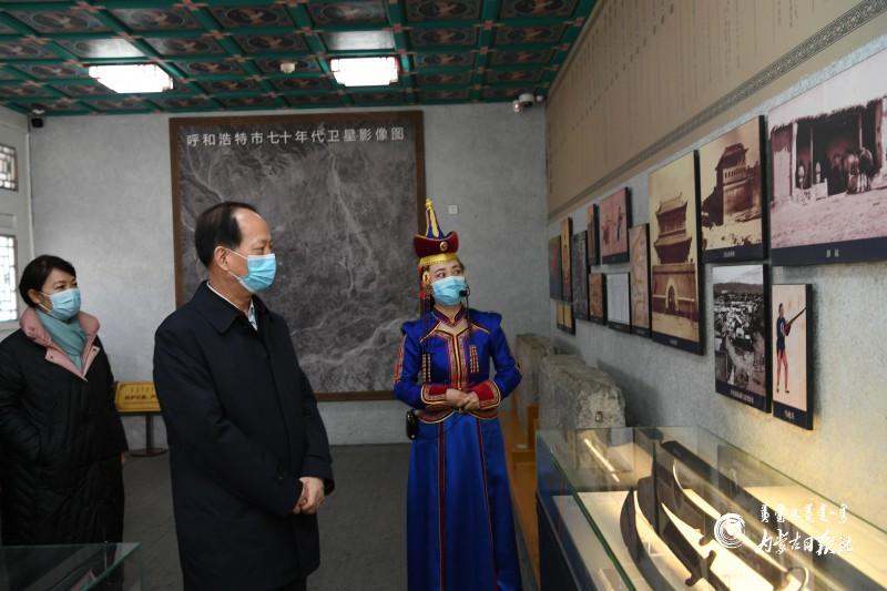 3月29日,自治区党委书记、人大常委会主任石泰峰在呼和浩特市新城区将军衙署博物院调研。内蒙古日报社融媒体记者 袁永红 摄 石泰峰参观昭君博物院、将军衙署博物院、内蒙古博物院,考察大召文化旅游项目,查看疫情防控举措,了解复馆复业情况。他说,内蒙古历史文化源远流长、底蕴深厚,具有独特魅力和吸引力。要深入挖掘历史文化内涵,突出民族和地域特色,体现时代特征,促进文化和旅游深度融合,推动实现高质量发展。要高度重视保护各类文物资源,发挥好文物承载灿烂文明、传承历史文化的重要作用。