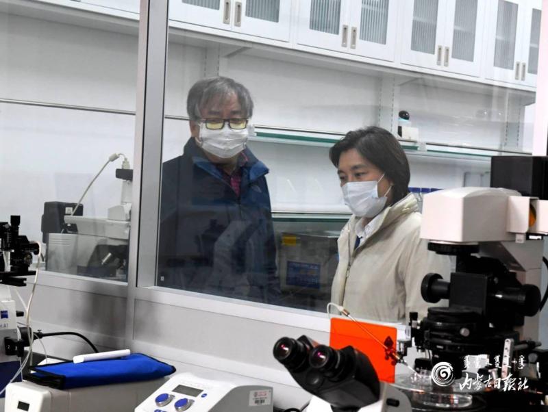 内蒙古大学“省部共建草原家畜生殖调控与繁育国家重点实验室”,于2017年9月获得自治区政府和科技部批准立项建设,是目前自治区唯一一所依托高校建立的国家重点实验室。在省部共建草原家畜生殖调控与繁育国家重点实验室,布小林详细了解实验室的研究重点、取得的成果以及转化应用等情况。她还与实验室李光鹏教授及科研人员深入交流,认真听取大家对自治区实施现代种业工程的意见和建议,希望实验室进一步汇聚科学研究能力,不断提升科技创新水平,为提高草原家畜繁育效率、选育优良草原家畜新品种、建立草原生态养殖模式作出贡献。