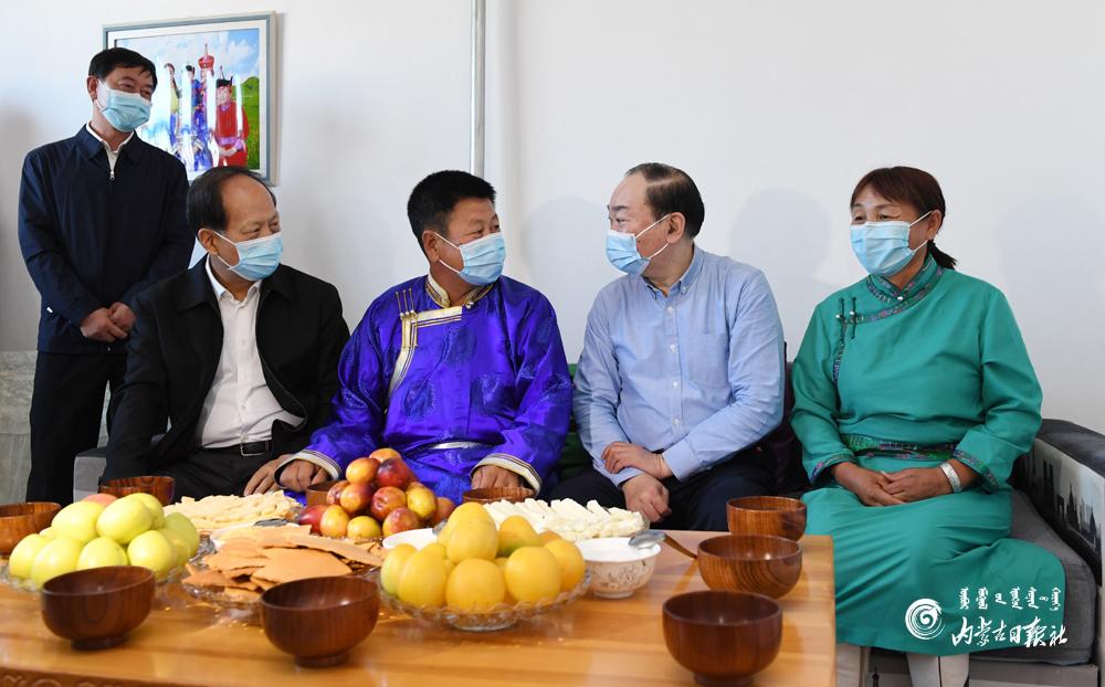 8月29日,中共中央政治局委员、中宣部部长黄坤明在自治区党委书记、人大常委会主任石泰峰陪同下,深入兴安盟科右中旗巴彦茫哈苏木哈图布其嘎查,走进牧户家中了解生产生活和脱贫情况。内蒙古日报社融媒体记者袁永红摄